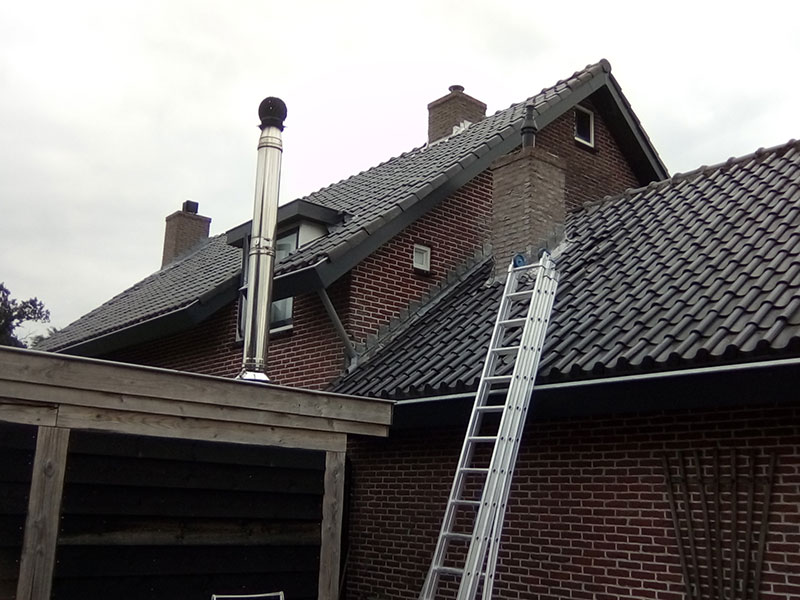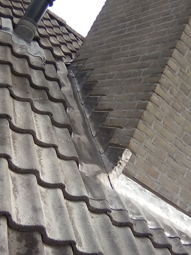 Lood vervangen aan de schoorsteen in Goirle.   Het loodwerk op de schoorsteen was in slechte staat. Met de bouw van deze woningen hebben ze gespaard op het loodwerk en deze ze kort mogelijk te houden. In de loop van de jaren is hier dus lekkage opgetreden. Het is erg belangrijk dat het lood