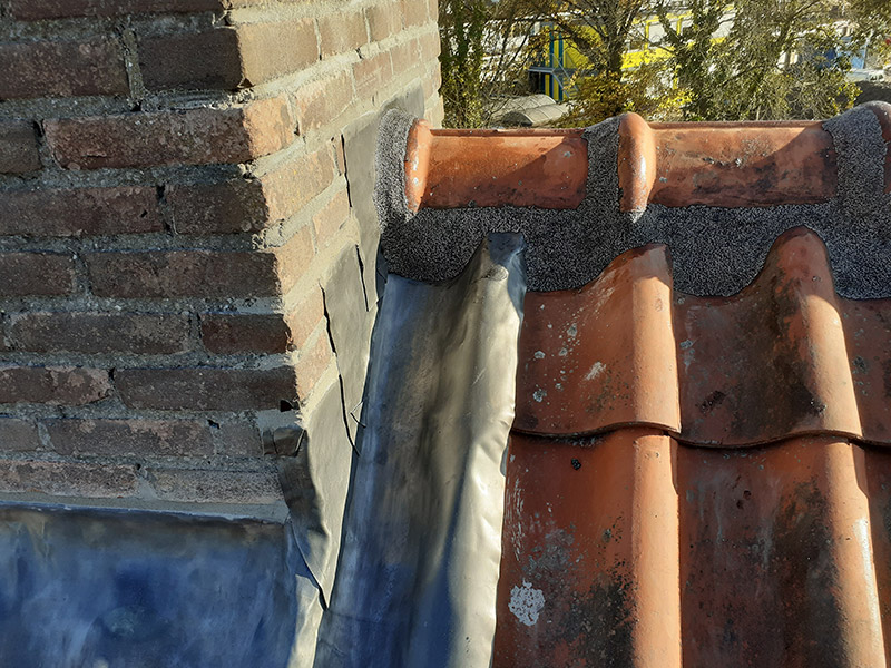 Vogelwering geplaatst & lood vervangen en aan de schoorsteen in Utrecht Vogelwering wordt geplaatst onder de eerste rij dakpannen dit voorkomt dat de vogels onder het dak kunnen komen. In het voorjaar is dit een veel voorkomend probleem met jonge vogels. Tevens beschermt het dakbeschot tegen opspattend water. Het loodwerk op de schoorsteen was